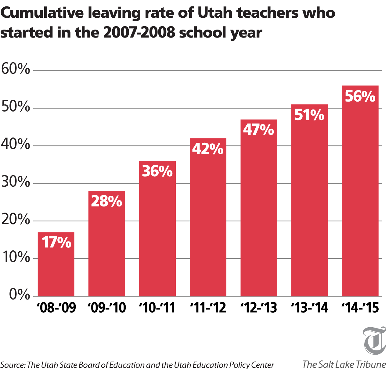 In Utah, 47 percent of new teachers leave the profession after five years in the classroom, according to a joint study from the Utah State Board of Education and the Utah Education Policy Center. After seven years, it’s 56 percent.